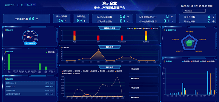 可實現(xiàn)風險管控、隱患情況、教育培訓、證照管理、應(yīng)急演練等不同維度數(shù)據(jù)統(tǒng)計分析,智能生成數(shù)據(jù)報表,為,為決策層制定安全目標和方針提供精準的數(shù)據(jù)支撐。