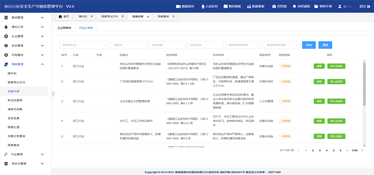 構(gòu)建安全投入(計劃及費用)、各類安全會議、制度化建設(shè)(法律法規(guī)、合規(guī)性評價、規(guī)章制度、操作規(guī)程等)模塊內(nèi)容的臺賬,便于實時查詢與調(diào)取。